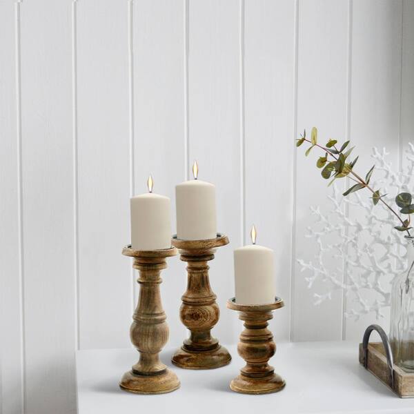 • vintage style pillar shaped candle stand with natural finish