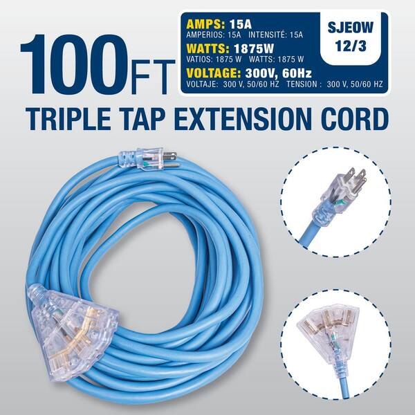 100 ft. 12/3 SJEOW 15 Amp/300-Volt All Weather Heavy-Duty Farm and Shop Extension Cord with Triple Tap Lighted End
