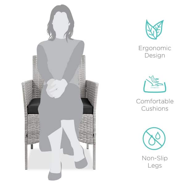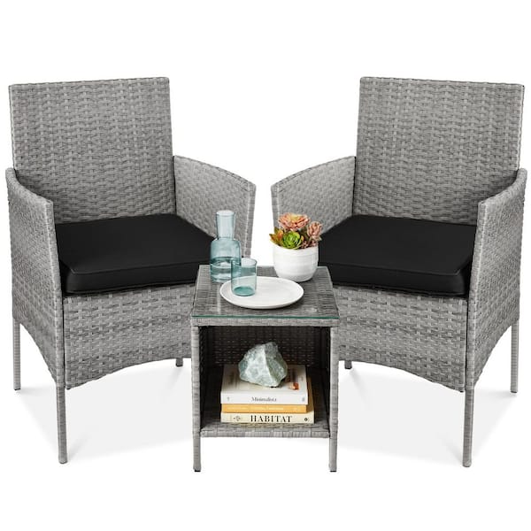 3-Piece Outdoor Wicker Conversation Patio Bistro Set, w/ 2-Chairs, Table, Cushions - Gray/Black