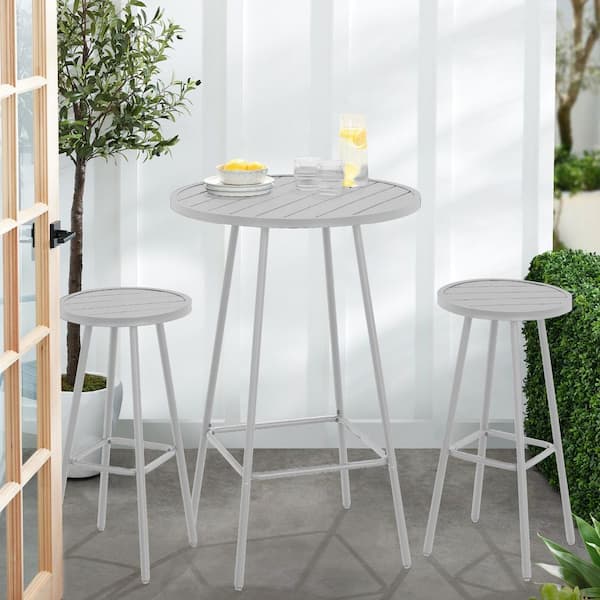 3-Piece Steel Patio Bar Height Round Outdoor White Bistro Set w/ Backless Stools