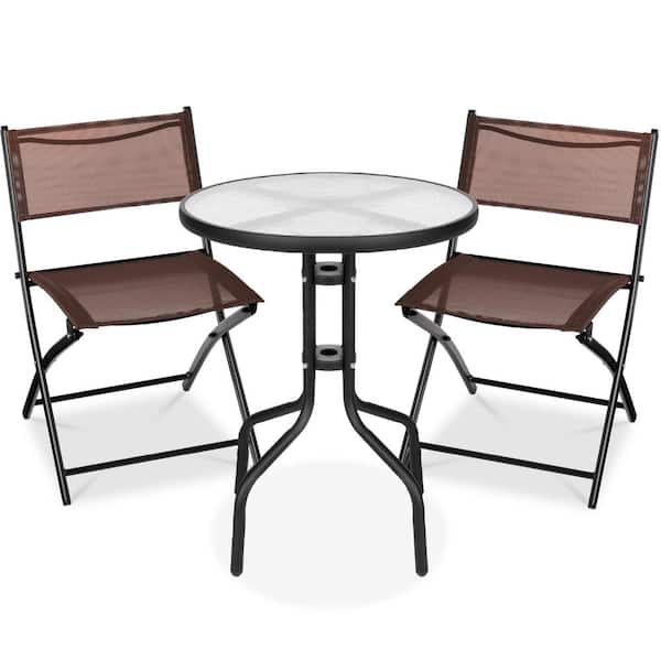 Brown Metal 3-Piece Outdoor Bistro Set with Textured Glass Table Top, Folding Chairs