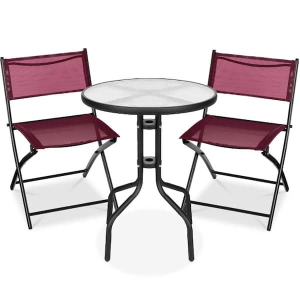 Burgundy 3-Piece Outdoor Patio Bistro Set with Textured Glass Table Top, Folding Chairs