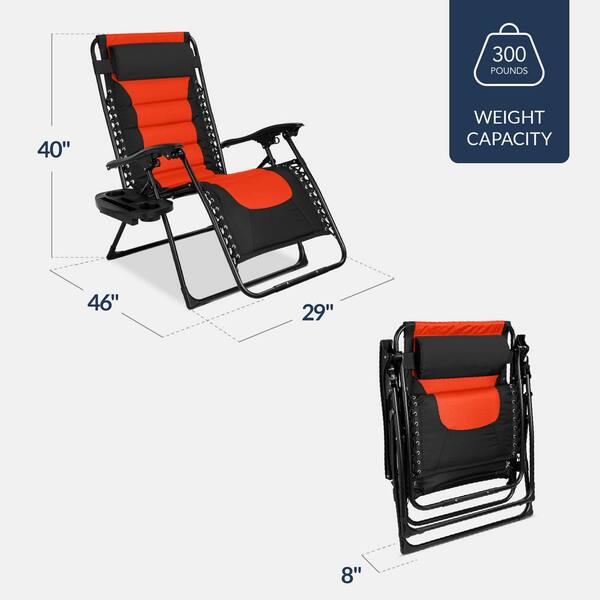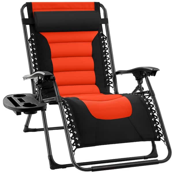 Oversized Padded Zero Gravity Black/Orange Metal Reclining Outdoor Lawn Chair with Side Tray