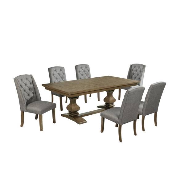 Ameen 7-Piece Rectangle Rustic Oak Finish Wood Top Dining Set with 4-Grey Linen Fabric Side Chairs and 2-Wing Chairs