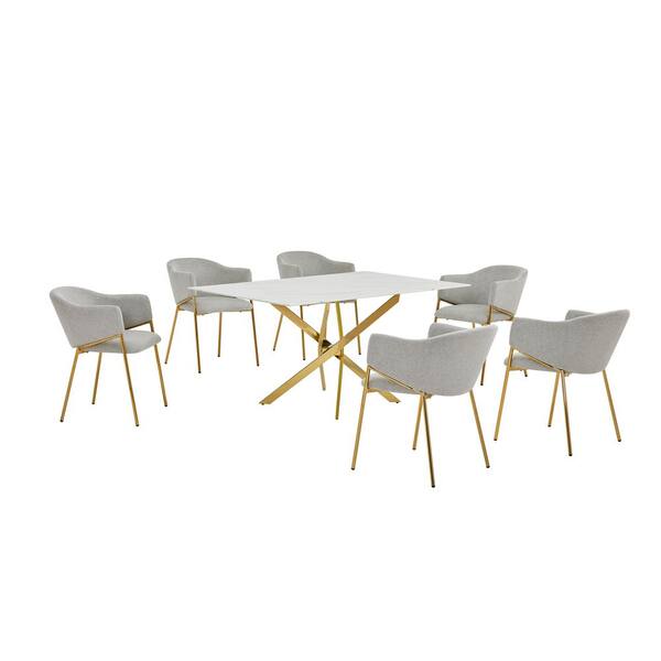 Esteban 7-Piece White Marble Wrap Glass Top Gold Stainless Steel Base Dining Set with 6 Grey Linen Fabric Chairs