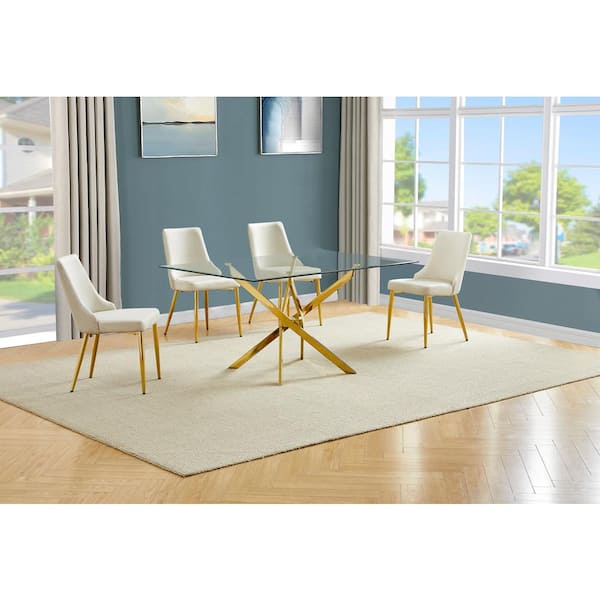 Olly 5-Piece Clear Glass Top Cross Leg Base Dining Set with 4 Cream Gold Chrome Chairs