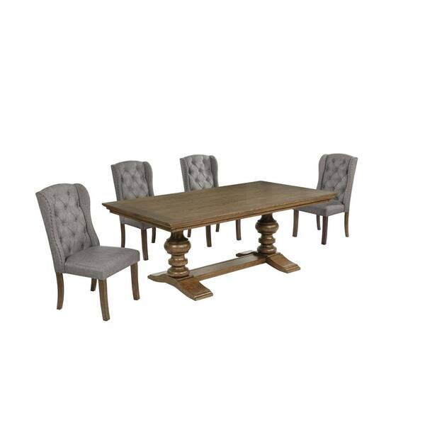Salama 5-Piece Rectangle Brown Oak Color Wood Top Dining Set With 4 Grey Linen Fabric Wing Chairs