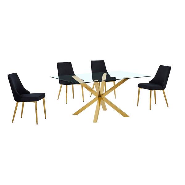 Tom 5-Piece Clear Glass Top Cross Leg Base Dining Set with 4-Black Gold Chrome Chairs