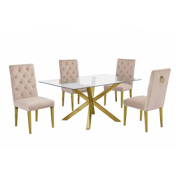 Tom 5-Piece Rectangle Glass Top with Gold Stainless Steel Base Table Set, 4-Cream/Beige Velvet Chairs W/Tufted Buttons