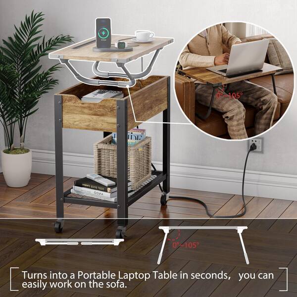 23.62 in. Weathered Rustic Oak Versatile End & Side Table with Removable Top, Casters, Outlet, and Storage Shelf