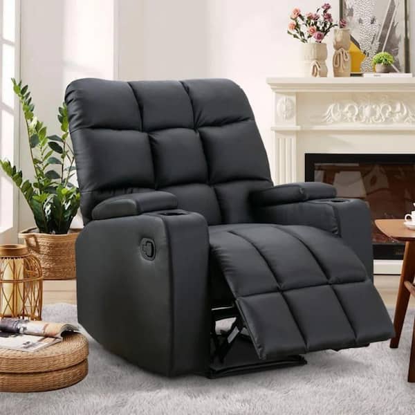 33.5 in. W Black Faux Leather Manual Recliner with Massage and Arm Storage and 2 Cup Holders