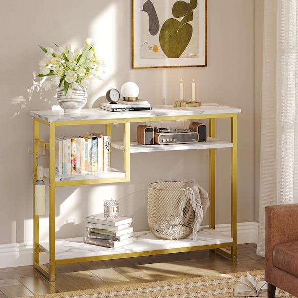 39.4 in. White Marble Color Rectangle Wood Console Table with 4 Tier Storage Shelves
