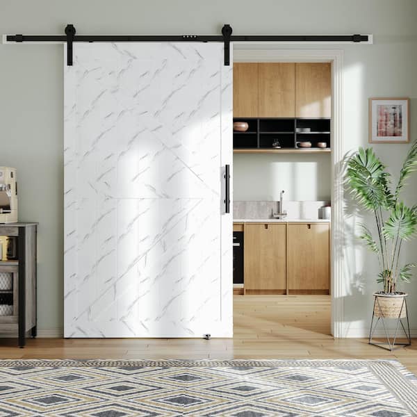 48 in. x 84 in. Paneled off White Marble Primed MDF K Shape Sliding Barn Door with Hardware Kit and Handle and Lock