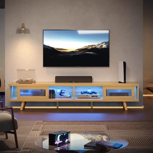 70 in. Mid-Century TV Stand Fits TVs up to 75 in. with LED Light Ribbed Glass Sliding Door and Open Shelves Natural Oak