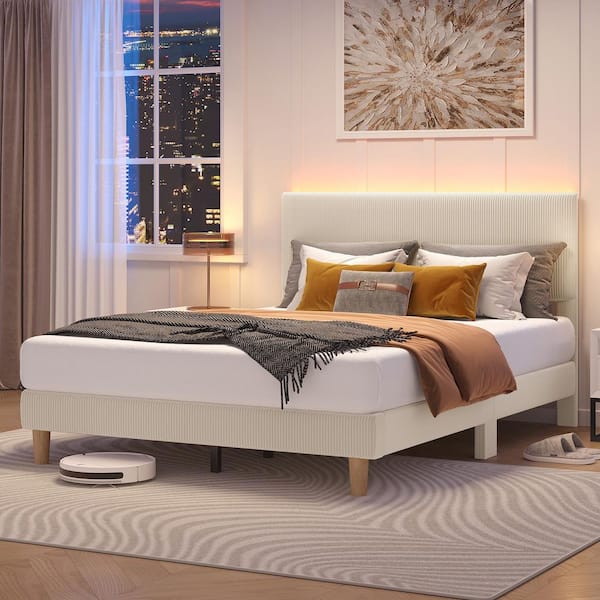 Beige Wood Frame Queen Platform Bed Upholestered Headboard with LED Lights