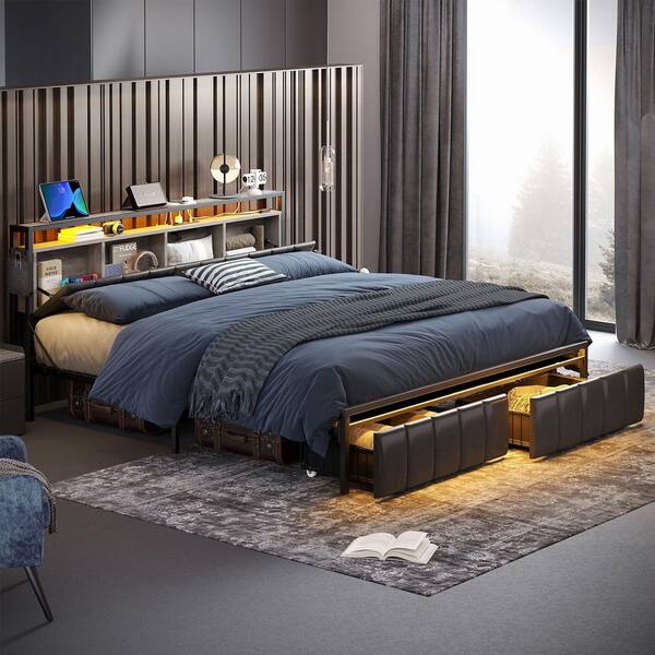 Gray Metal Frame King Size Platform Bed with Storage Drawers and LED Headboard with Charging Station