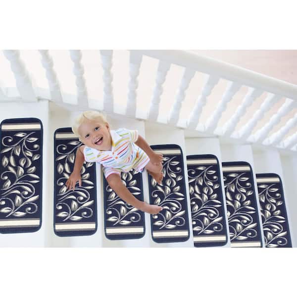 New Navy 8.5 in. x 26 in. Floral Non-Slip Stair Tread Cover (Set of 8)