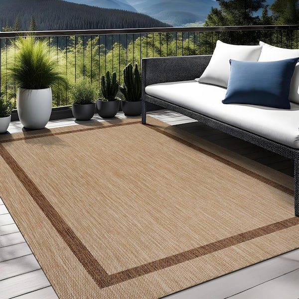 Waikiki Beige/Brown 10 ft. x 14 ft. Bordered Indoor Outdoor Area Rug