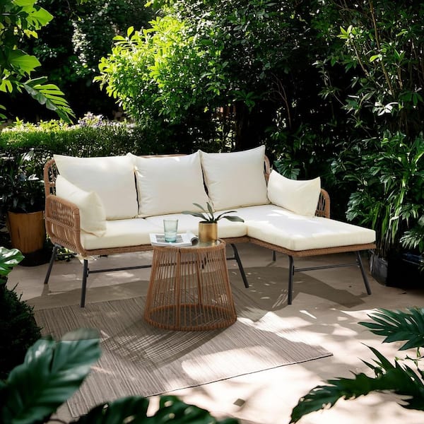 3-Piece Wicker Patio Conversation Set with Beige Cushions, Rattan Furniture Set with Coffee Table
