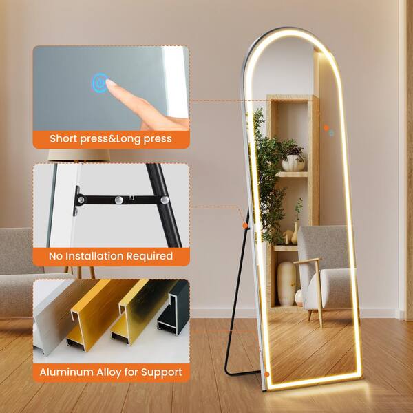 Black 20 in. W x 63 in. LED Modern Arched Floor Standing Mirror with 3-Color Lighting
