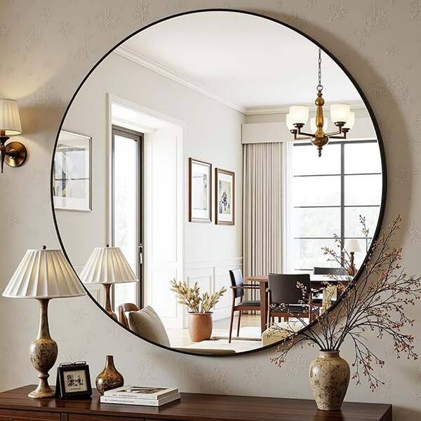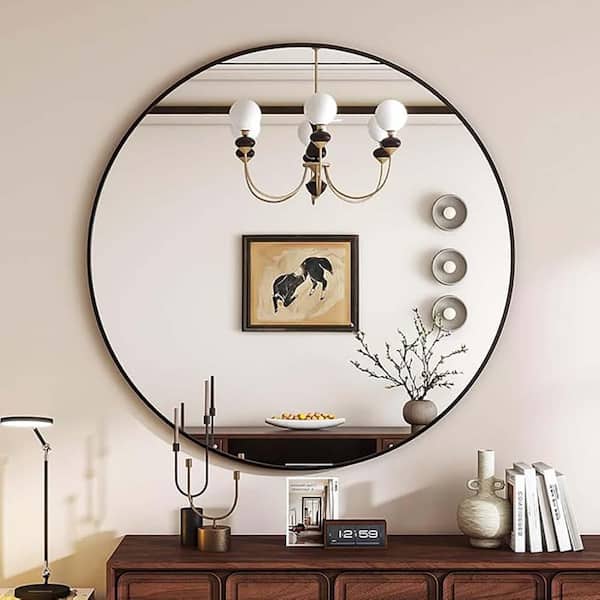 Black 24 in W x 24 in. H Metal Round Bathroom Mirror