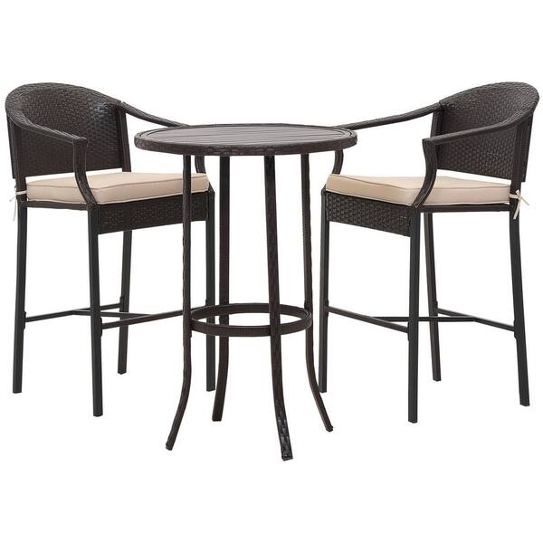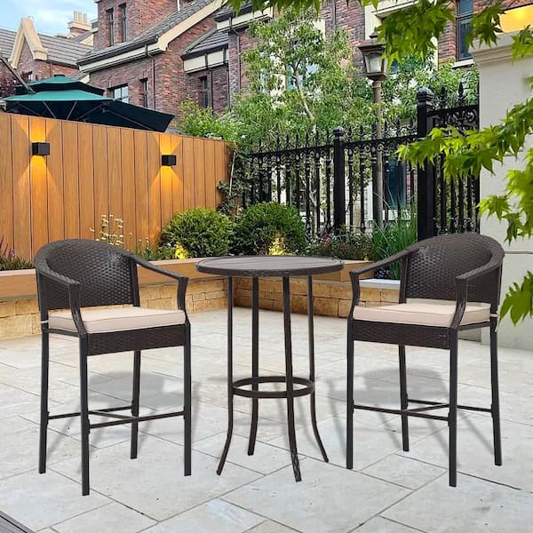 Black 3-Piece Metal Outdoor Bistro Patio Bar Wicker Outdoor Dining Set with Beige Cushion, Bar Table