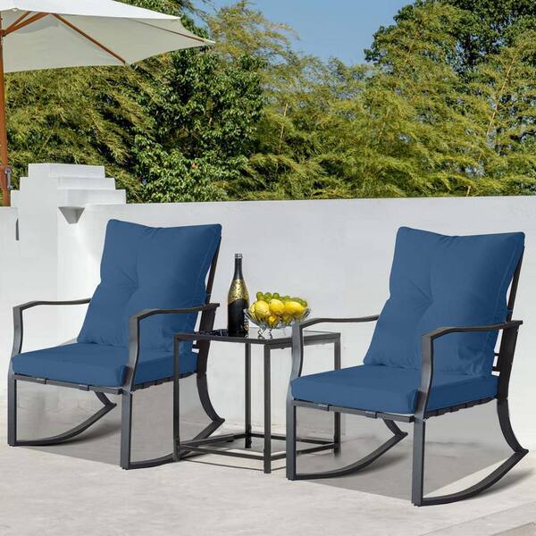Black 3-Piece Metal Outdoor Bistro Set Patio Steel Conversation with Glass Coffee Table and Blue Cushion for Garden