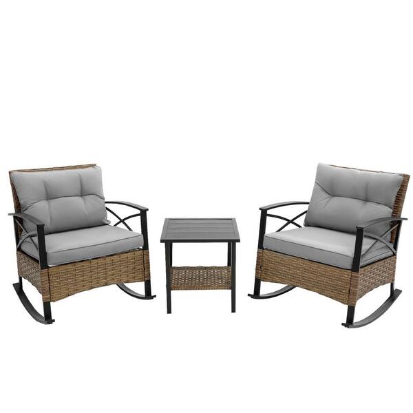 Black 3-Piece Metal Outdoor Rocking Chair with Gray Cushions, 2-Rocking Chairs and 1-Table