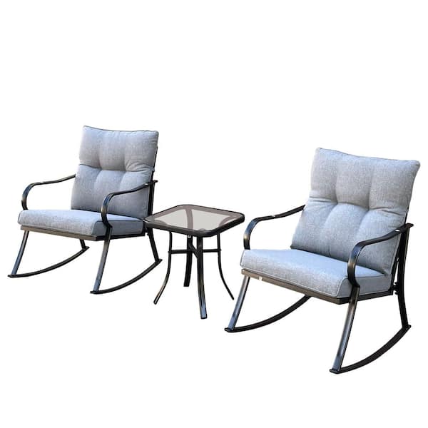 Black 3-Piece Metal Patio Outdoor Bistro Set Conversation Set with 2 Rocking Chairs, Coffee Table, Gray Cushions