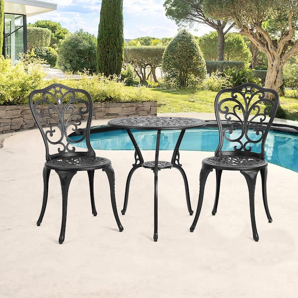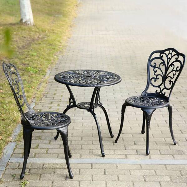 Black 3-Piece Rust-Resistant Aluminum Outdoor Bistro Set Dining Set with 1.77 in. Umbrella Hole