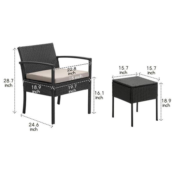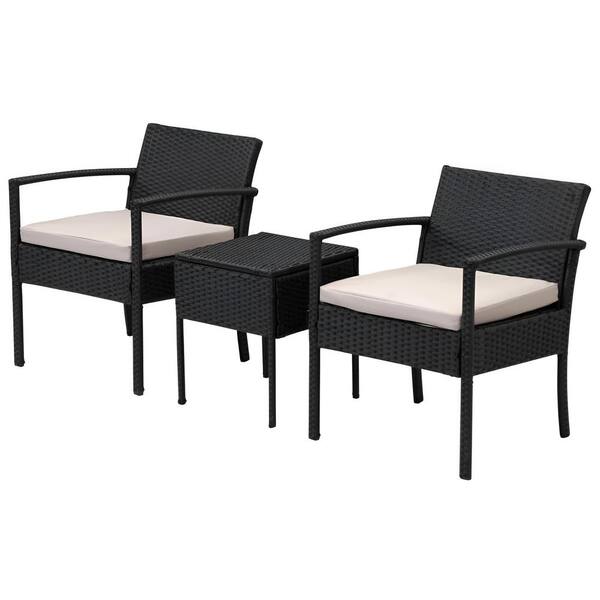 Black 3-Piece Wicker Patio Conversation Set, Outdoor Rattan Chairs and Table Set with Gray Cushions For Balcony, Garden
