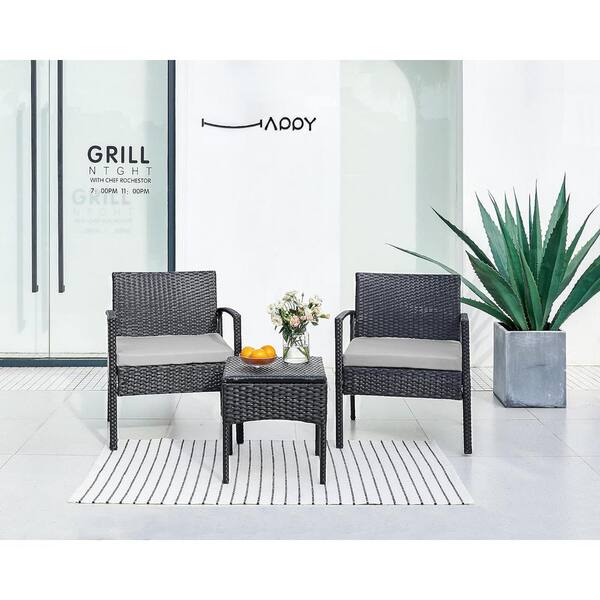 Black 3-Piece Wicker Patio Conversation Set, Outdoor Rattan Chairs and Table Set with Gray Cushions For Balcony, Garden
