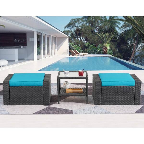 Black 3-Piece Wicker Patio Conversation Set with Blue Cushions