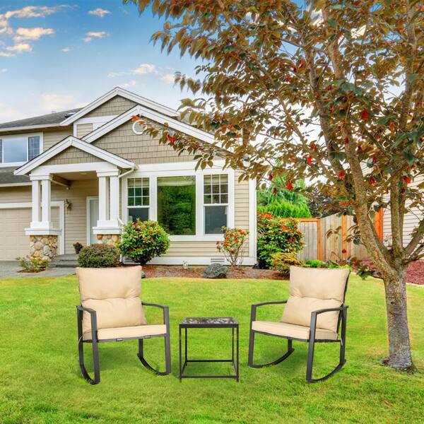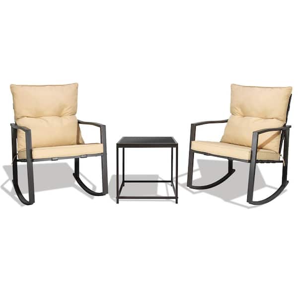 Black 3-Pieces Metal Patio Rocking Chair Set, Conversation Sets with Tempered-Glass Table, Sand Cushions
