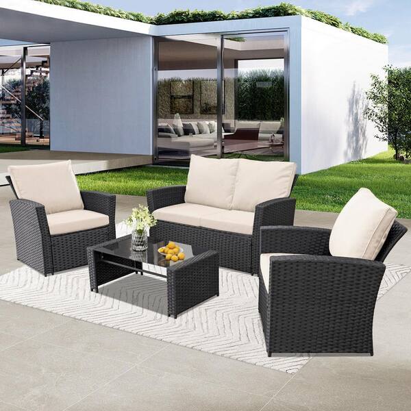Black 4-Piece Wicker Outdoor Sofa Sectional Set Conversation Set with Beige Cushions and Tempered Glass Table