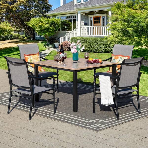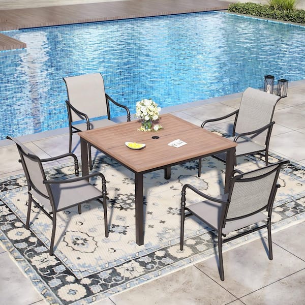 Black 5-Piece Metal Outdoor Patio Dining Set With Wood-Look Square Table and Gourd-Shaped Design Textilene Chairs