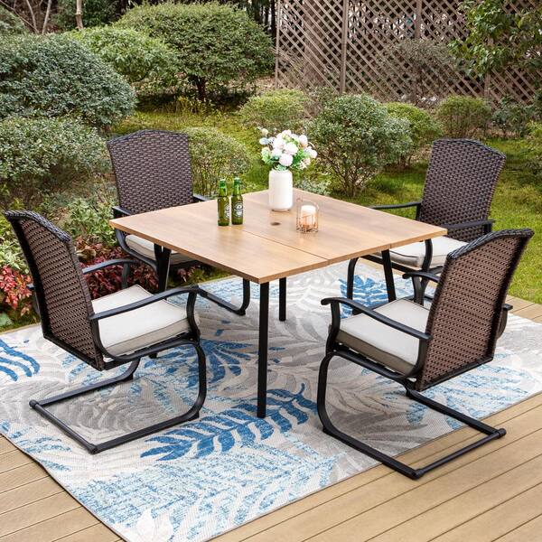 Black 5-Piece Metal Patio Outdoor Dining Set with Wood-Look Square Table and FanSshaped Rattan C-Spring Cushioned Chair