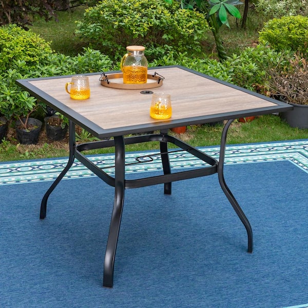 Black 5-Piece Metal Wood-Look Square Table Outdoor Patio Dining Set with Red Textilene Chairs