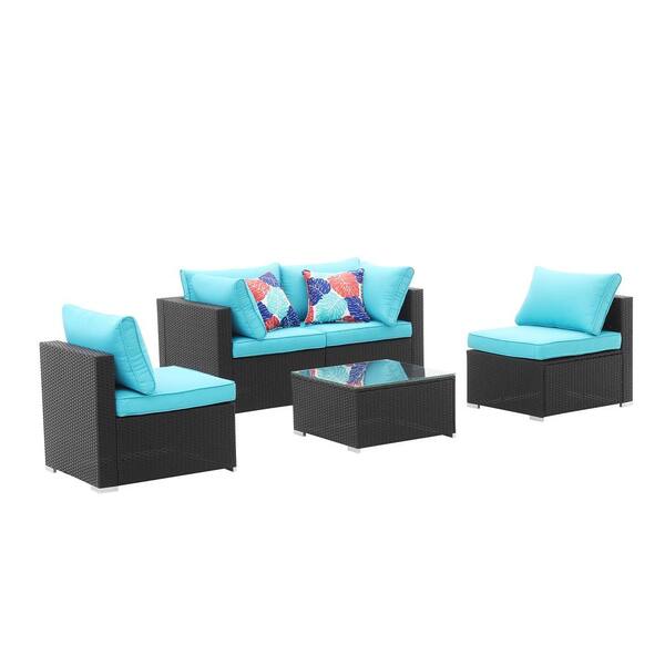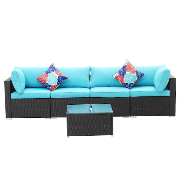 Black 5-Piece Wicker Outdoor Patio Furniture Sofa Set with Blue Cushion