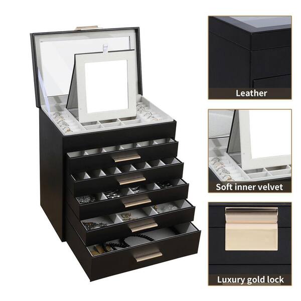 Black 6-Layer Jewelry Box with Glass Lid-Organizer for Necklaces, Bracelets, Earrings, 11 in. x 6.6 in. x 10.2 in.