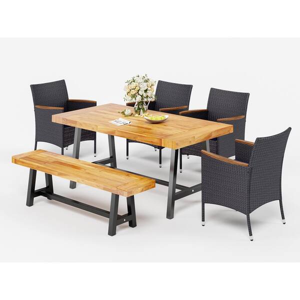 Black 6-Piece Metal Patio Acacia Wood Outdoor Dining Set with Rectangular Table, 4 Rattan Chairs and Long Bench