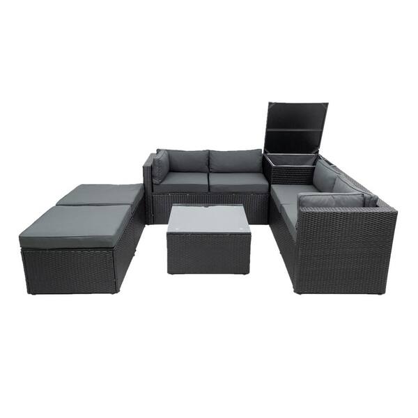 Black 6-Piece Rattan Patio Sofa Set with Storage Box and Removable Gray Cushions