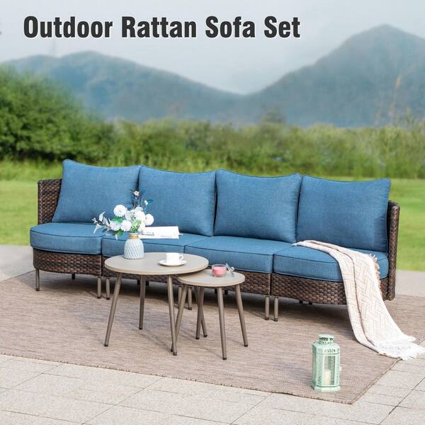 Black 6-Pieces Metal Patio Conversation Sectional Seating Set with 2 Round Coffee Table, Brown Rattan and Navy Cushions