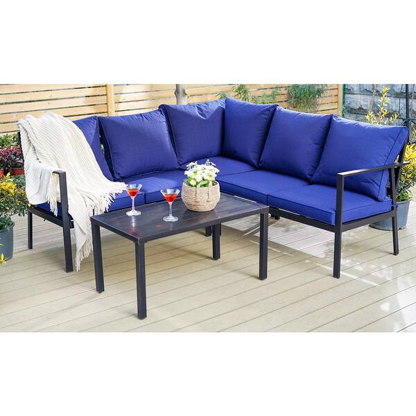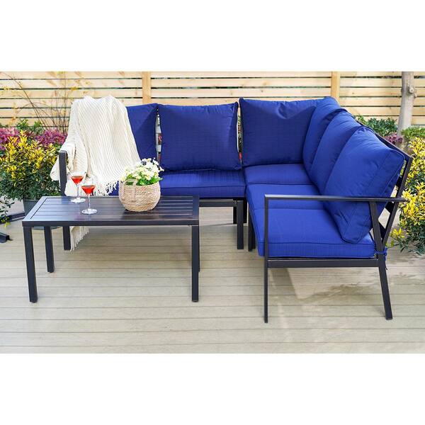 Black 6-Pieces Metal Patio Conversation Sectional Seating Set with CushionGuard Blue Cushions