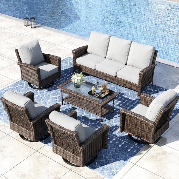 Black 6-Pieces Metal Patio Conversation Sectional Seating Set with Swivel Sofa Chairs, Glass Top Table and Gray Cushions