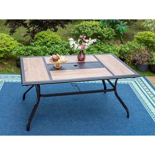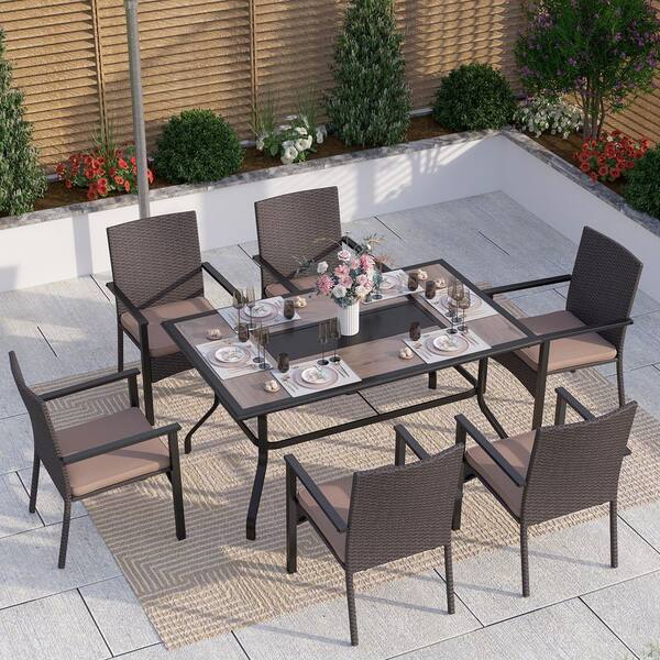 Black 7-Piece Geometric Rectangle Table Metal Patio Outdoor Dining Set with Rattan Chairs with Beige Cushion