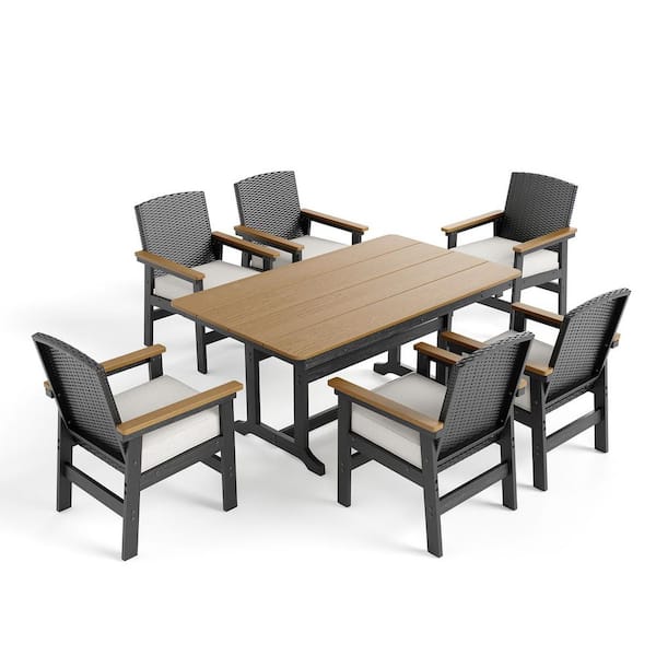 Black 7-Piece HDPE Plastic Patio Outdoor Dining Set with Wood-Grain Rectangle Table and Rattan Chairs with Beige Cushion