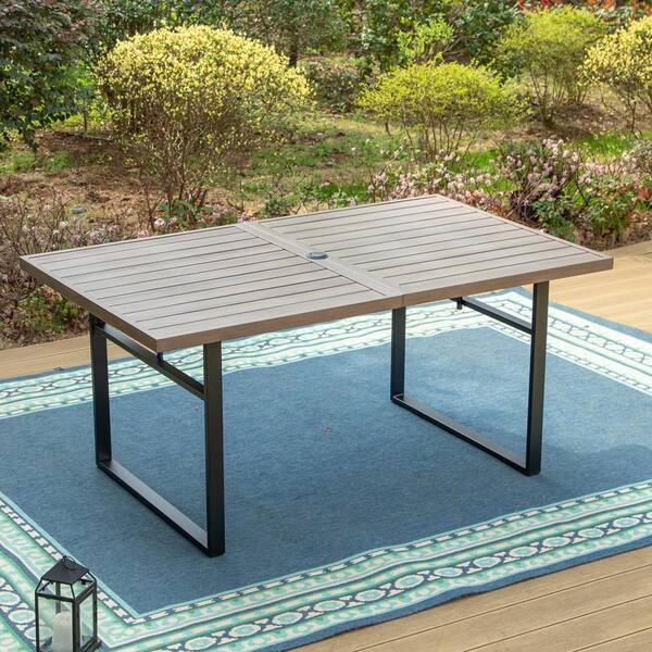 Black 7-Piece Metal Outdoor Dining Set with Dark Brown Rectangular Table and Padded Swivel Rocker Texitilene Chairs