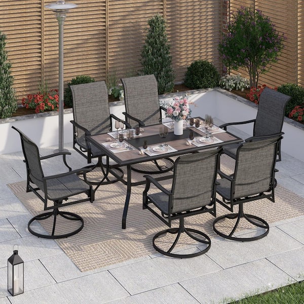 Black 7-Piece Metal Outdoor Patio Dining Set with Geometric Rectangle Table and Padded Textilene Swivel Chairs