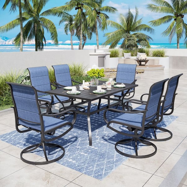 Black 7-Piece Metal Outdoor Patio Dining Set with Slat Rectangle Table and Padded Blue Textilene Swivel Chairs